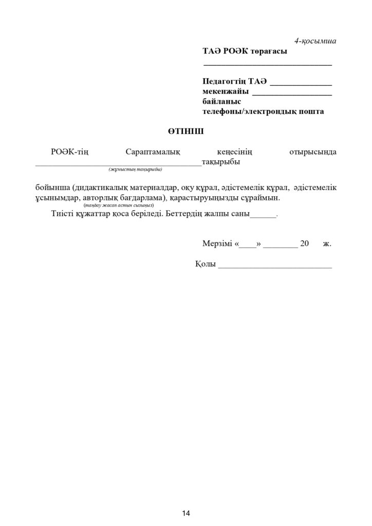 Материалдар сараптамалық кеңес отырысына кемінде 2 ай бұрын аудандық сараптамалық кеңестердің ұсыныстарына сүйене отырып, білім бөлімінің бірінші басшылары арқылы облыстық сараптамалық кеңеске қағаз немесе электрондық түрде 1-қосымшаға сәйкес жіберіледі. Барлық беттер нөмірленуі тиіс. Ұсынылған материалдар рәсімдеу талаптарына сай болмаса, тіркелмейді және кері қайтарылады