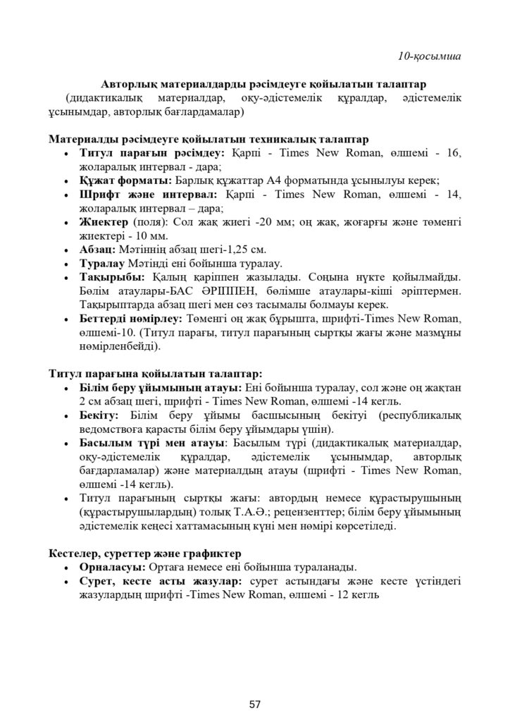 Авторлық материалдар (дидактикалық материалдар, оқу және әдістемелік құралдар, әдістемелік ұсынымдар, авторлық бағлардамалар) рәсімдеуге қойылатын бірыңғай талаптарға сай жазылады (10-қосымша)
